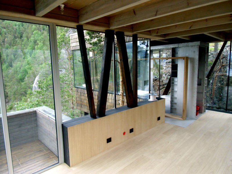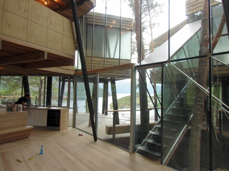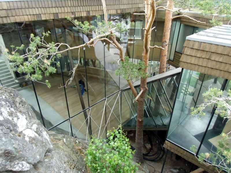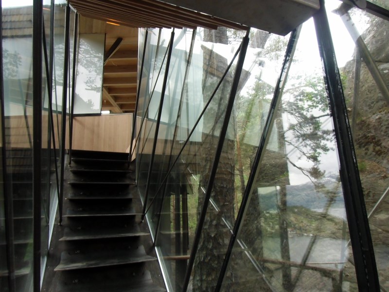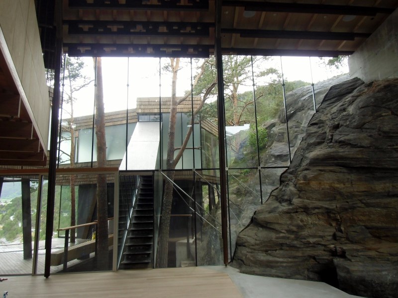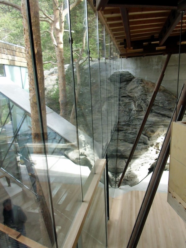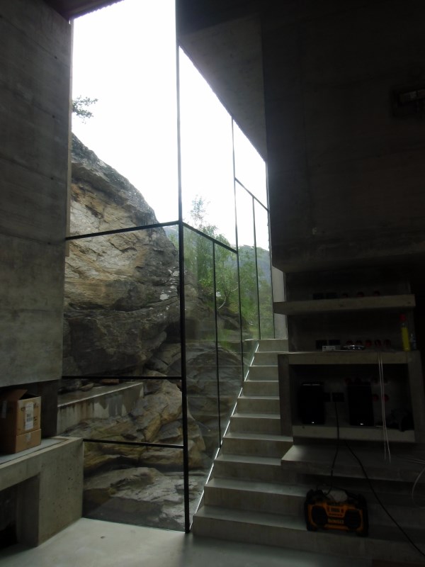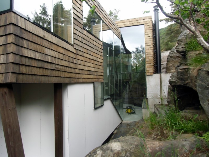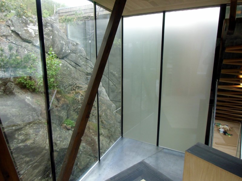 Glasset er montert så og si uten profiler i høyder opp til 6 meter. I hjørner er det benyttet step kanter på glasset. En del av glasset er montert i slisser skåret ned i fjellet. Det må også nevnes at det ikke er bilvei frem til hytta og alt glass er fraktet inn med helikopter. Tegnet av arkitektfirmaet Jensen & Skodvin.
