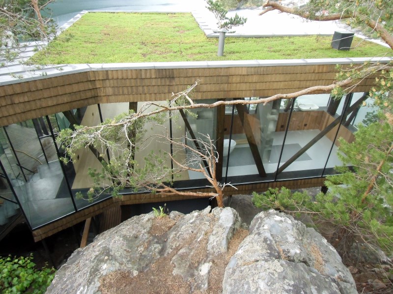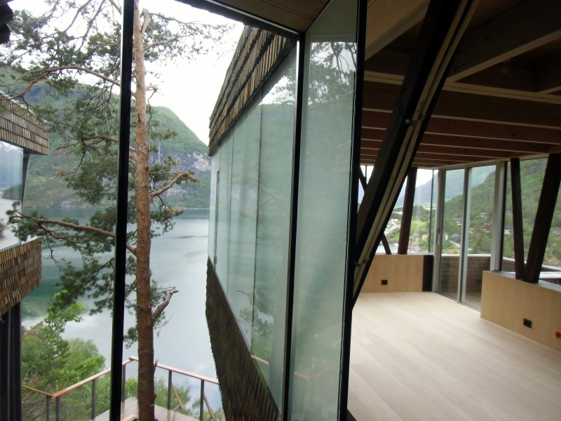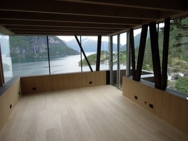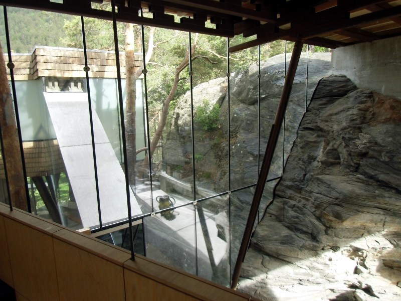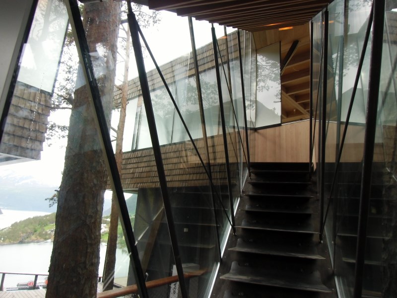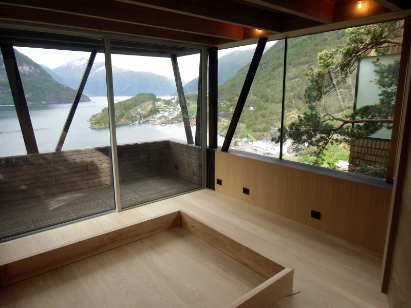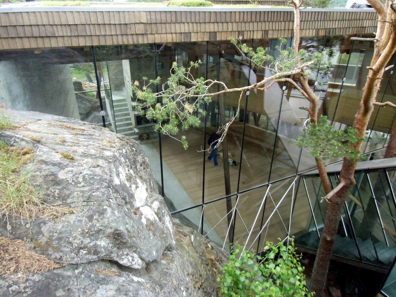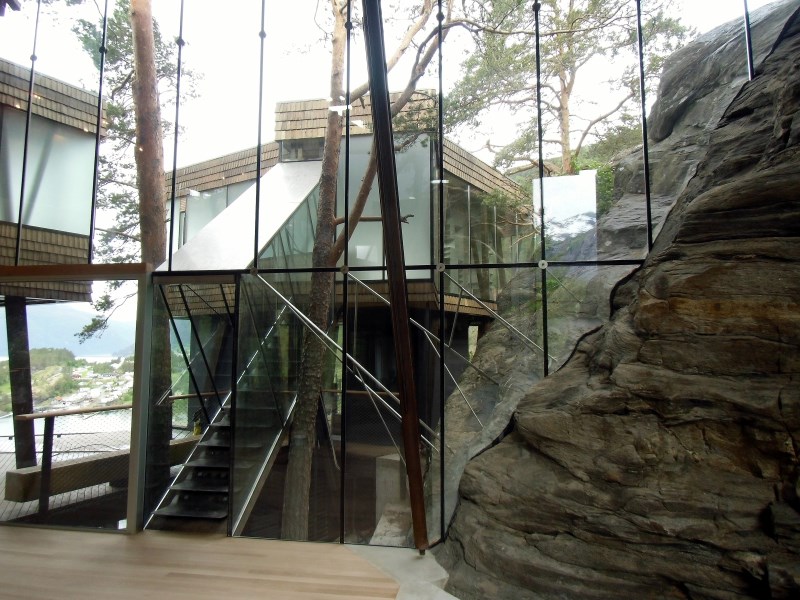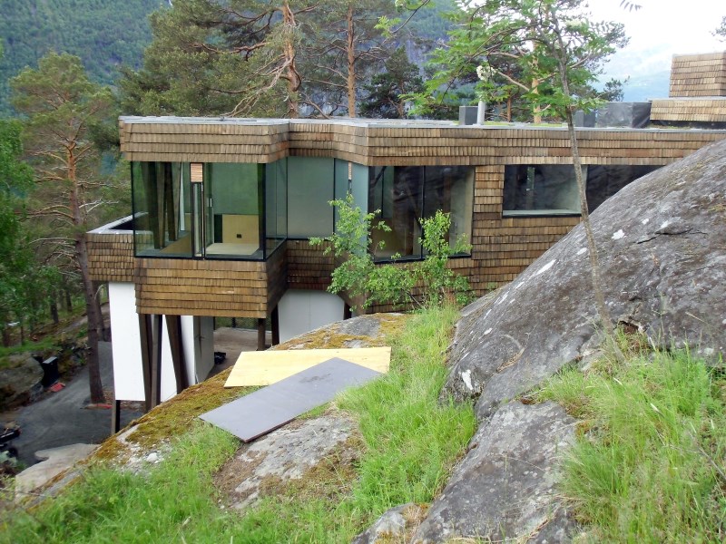 Glasset er montert så og si uten profiler i høyder opp til 6 meter. I hjørner er det benyttet step kanter på glasset. En del av glasset er montert i slisser skåret ned i fjellet. Det må også nevnes at det ikke er bilvei frem til hytta og alt glass er fraktet inn med helikopter. Tegnet av arkitektfirmaet Jensen & Skodvin.