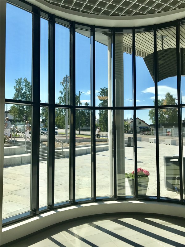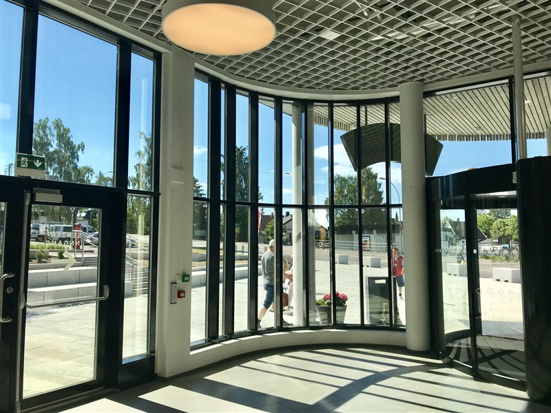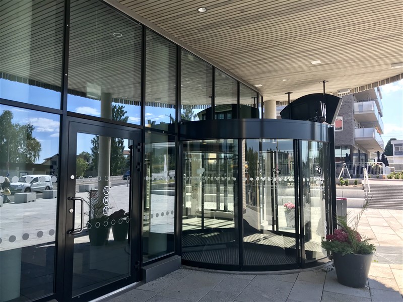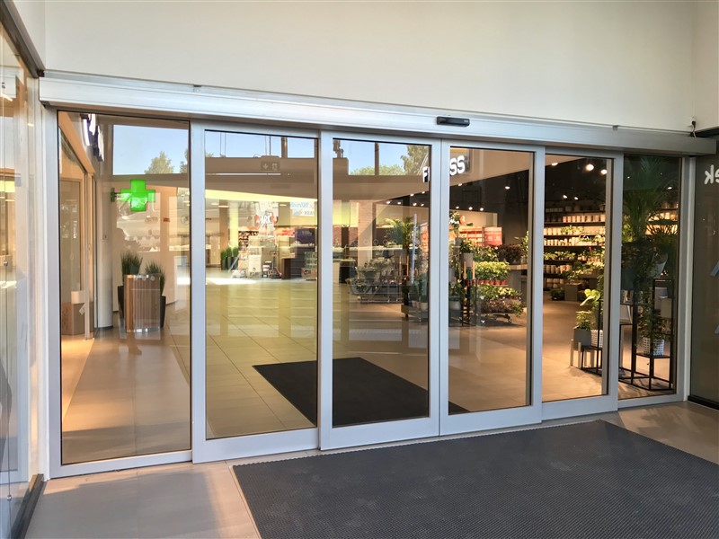 Alu – glass fasader i fasade profilsystem Sapa 4150, dører i termo profilsystem Sapa 74. Automatiske skyvedører og teleskopdører i profilsystem Sapa 74/50 Automatic.