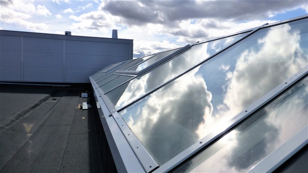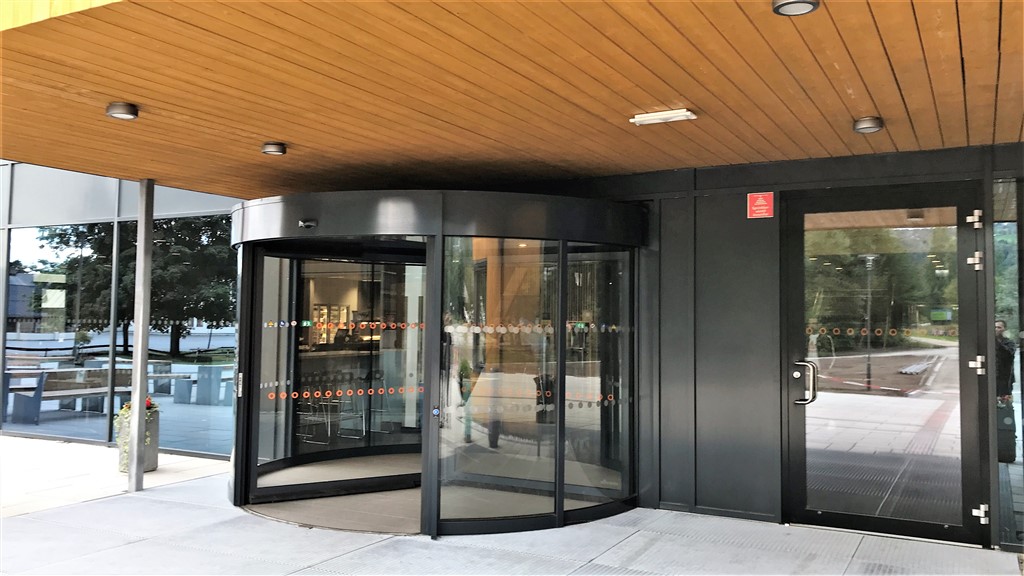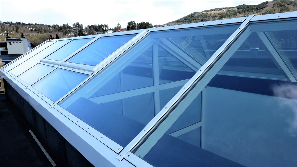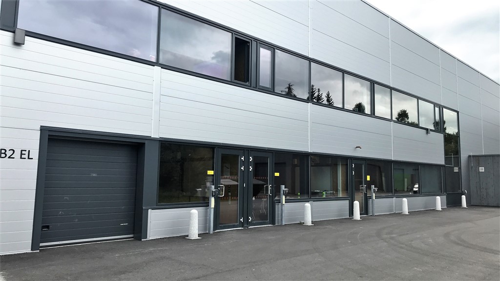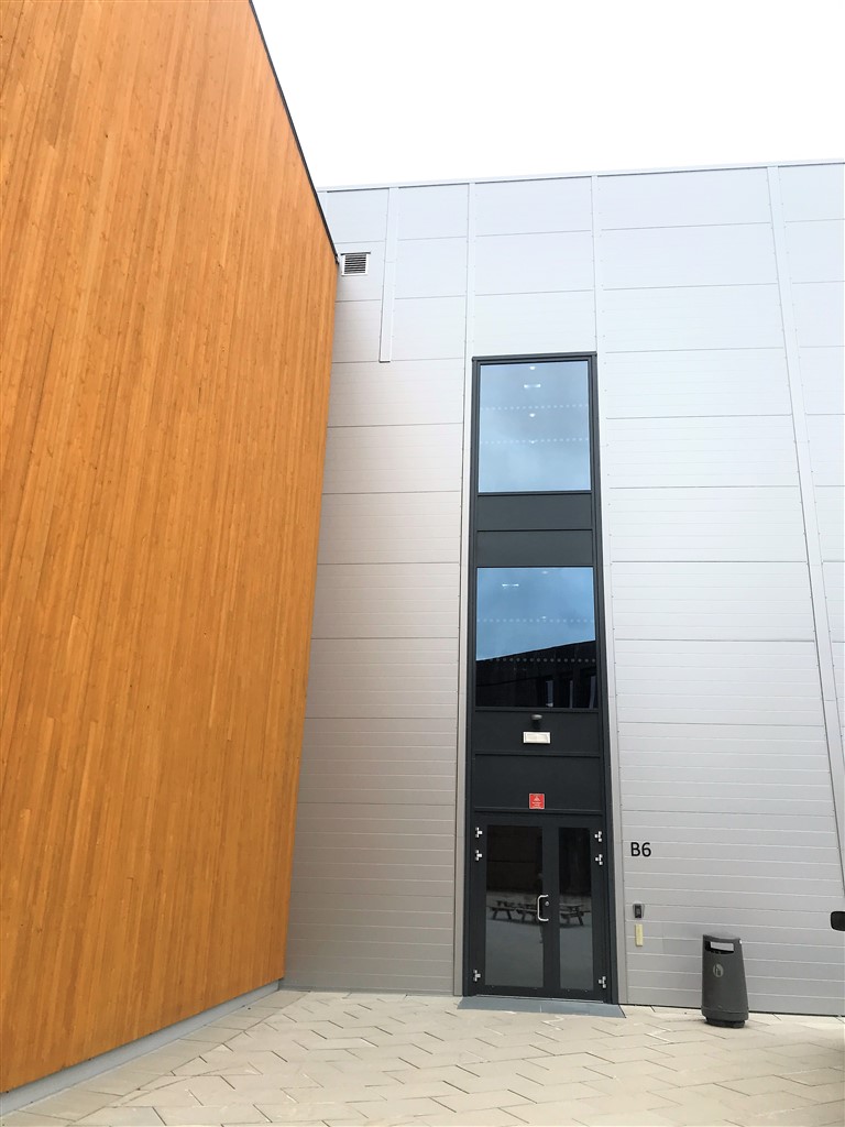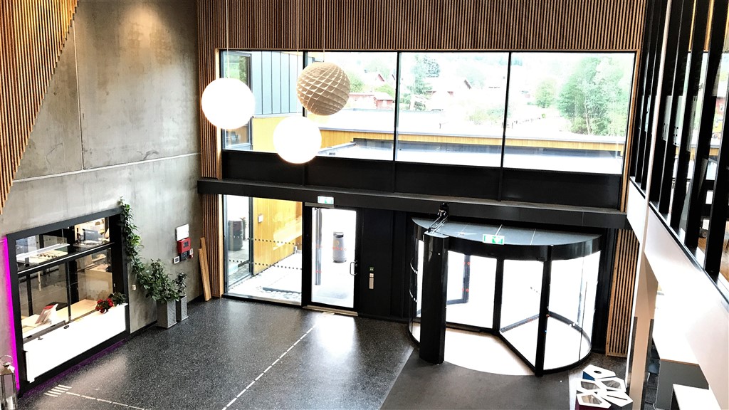 Alu- glass fasadefelter i fasade profilsystem Sapa 4150, alu-glass vinduer og dører i termo profilsystem Sapa 2074. Vi har også levert karusell inngangsdør fra Boon Edam.