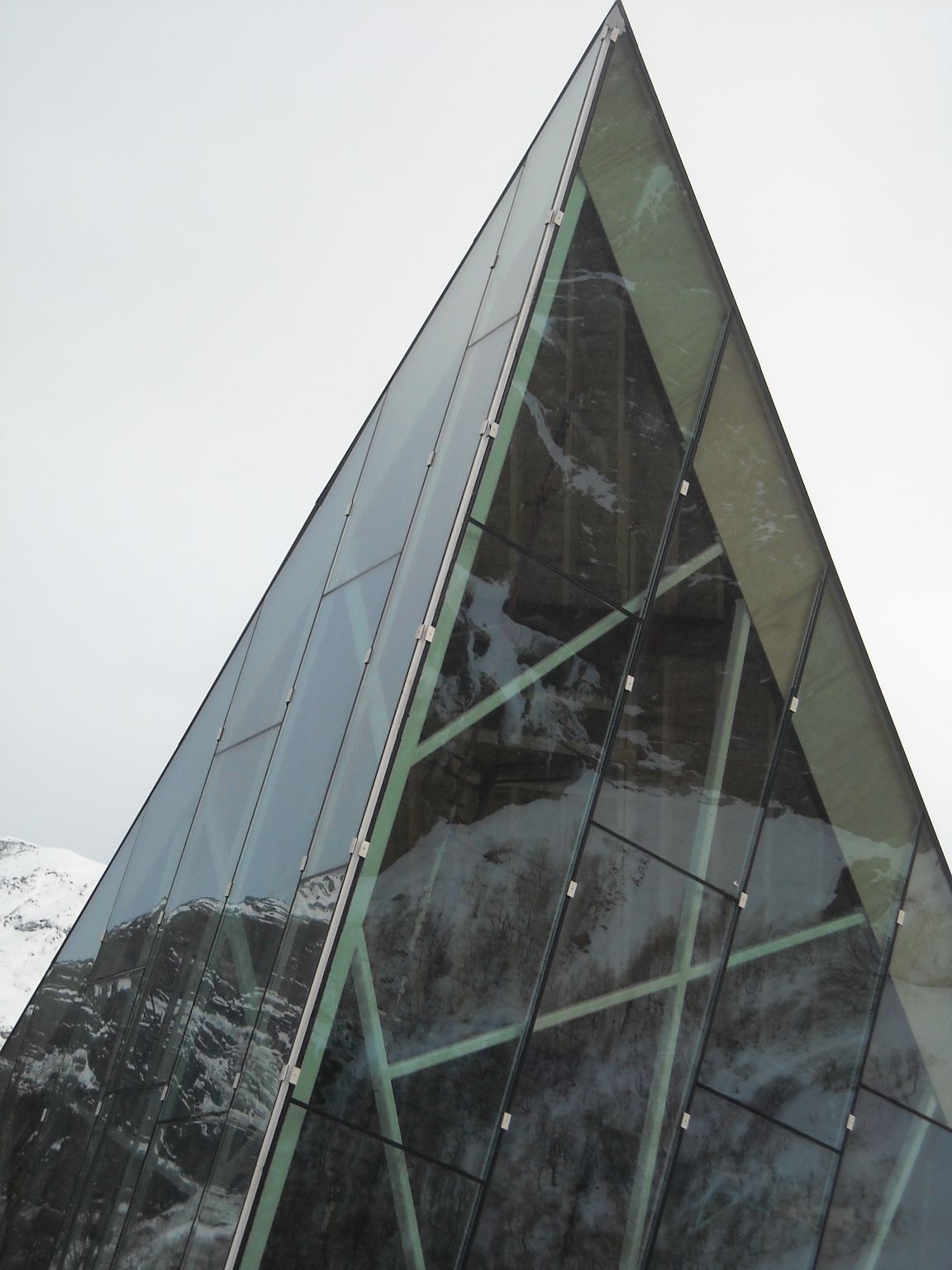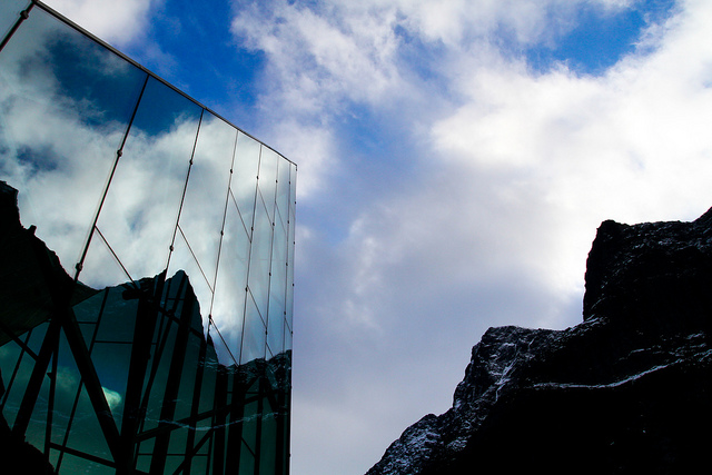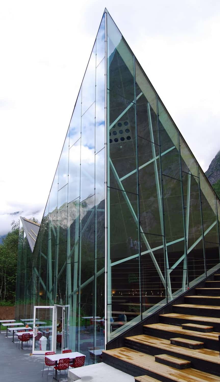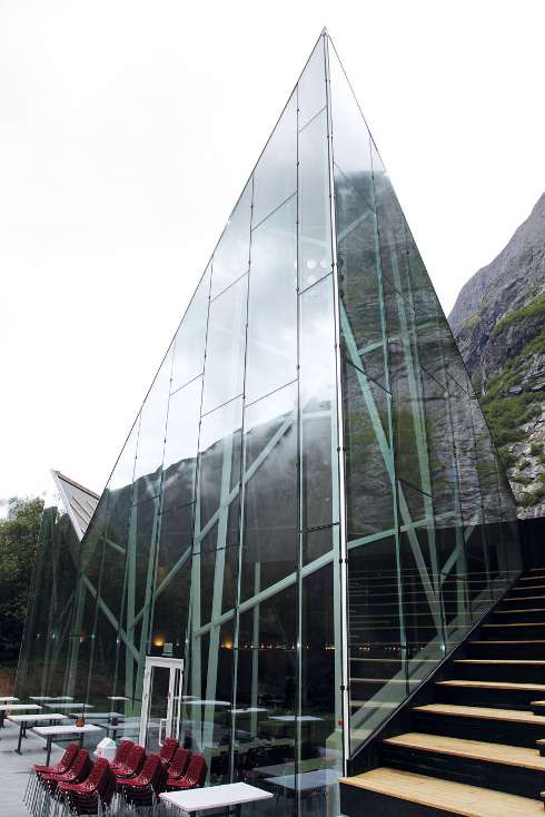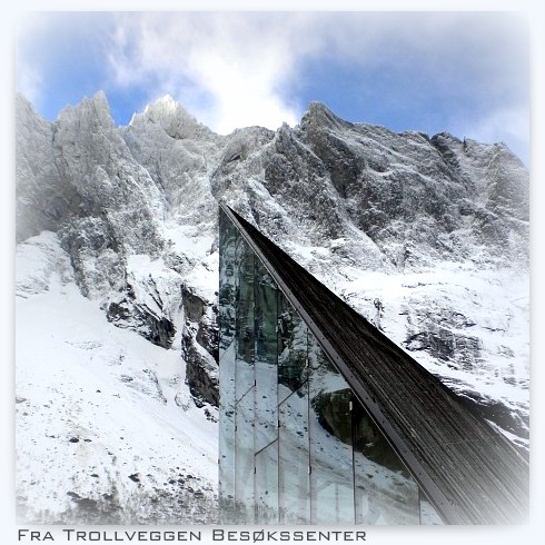 Norske Metallfasader har levert og montert glasset og alu dører til fasaden i Trollveggen Besøkssenter v/Åndalsnes.